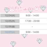 12/28 13〜18時 12/29 9〜13時30分 12/30 9〜13時 ? ? 年末はこんな感じになります??♀? よろしくお願いします?? 23,24日のサンタコスは指名の方だけの 予定です?(多分) 変わるかもしれないので、来た方のお楽しみということで?? ではでは、おやすみなさい? |